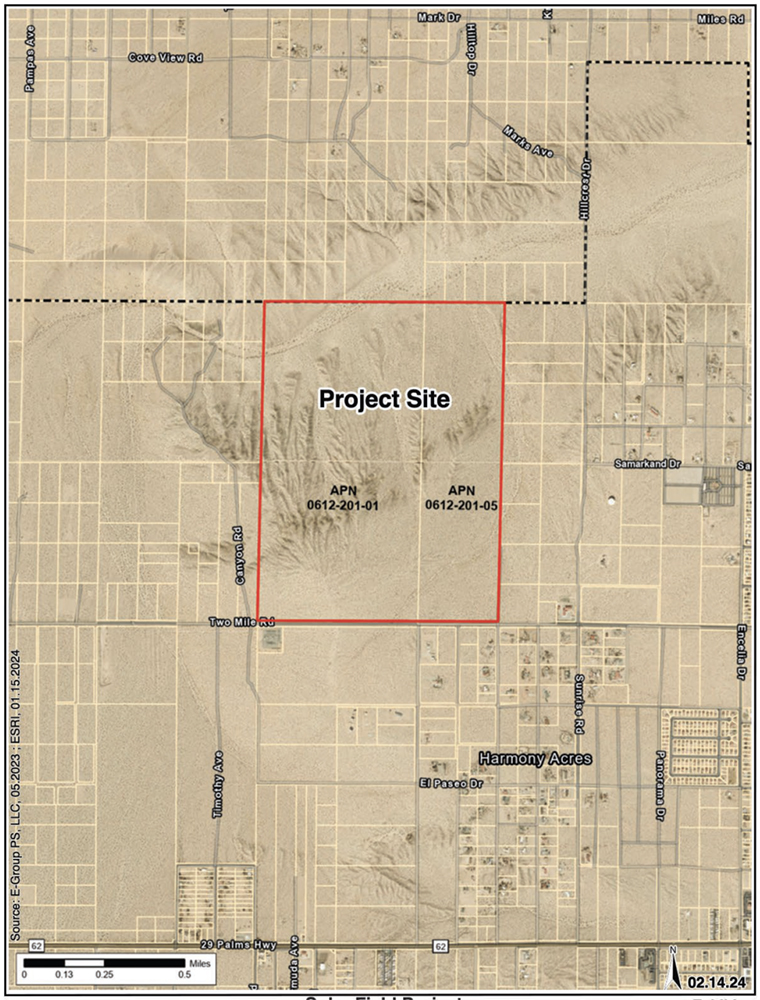 From E-GROUP: The Project as a whole encompasses 477± acres, and will include two General Plan Amendments (GPA), two Rezones (REZ), a Development Code Amendment (DCA), a Conditional Use Permit (CUP), and a Development Agreement. The GPAs include 1) General Plan text and map amendments to add a new Renewable Energy land use district, and apply it to the northern 241 acres of the Project site on the Land Use Map, and 2) a General Plan map amendment to redesignate the southern 236 acres of the Project site from Rural Living (RL-5) and Single-Family Residential – Estate (RS-E) to Single Family Residential, 1 acre minimum (RS-1). The REZs include 1) adding a new Renewable Energy district, which also requires a DCA to create development standards and permitted uses, and applying it to the northern 241 acres of the Project site on the Zoning Map, and 2) a Zoning Map amendment to re-designate the southern 236 acres of the Project site from RL-5 and RS-E to RS-1. The Conditional Use Permit is to allow the solar project to be constructed on the northern portion of the site. The Development Agreement is to address community benefit responsibilities of the applicant.